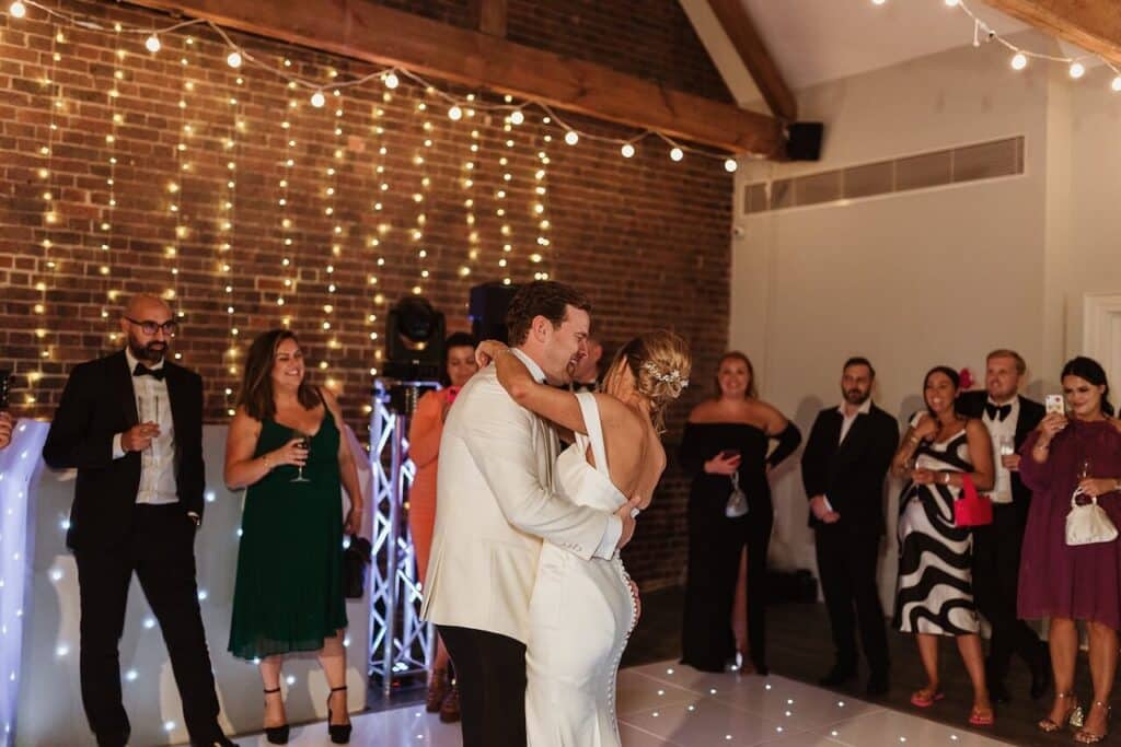 Elegant wedding reception setup in a luxury, affordable Kent wedding venue, featuring long banquet tables, exposed brick walls, wooden beams, and soft string lighting.